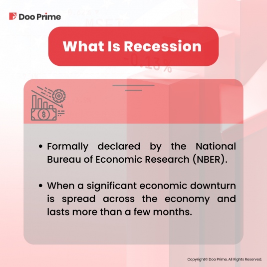 Recessions are formally declared by the National Bureau of Economic Research (NBER). A recession is recognized when a significant economic downturn is spread across the economy and lasts more than a few months.