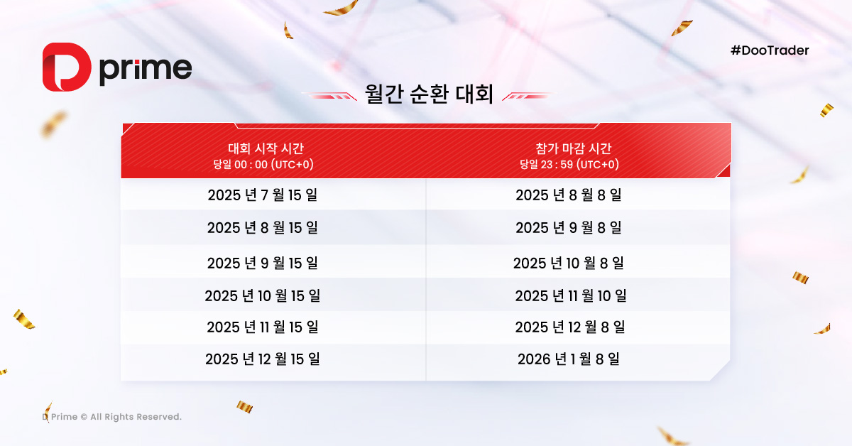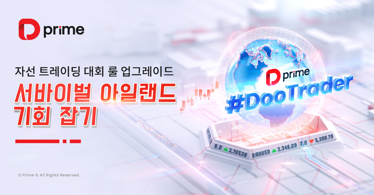 2025년 D Prime #DooTrader 자선 트레이딩 대회는 교류와 혁신, 성장을 아우르는 고급 트레이딩 이벤트입니다.총 9개월에 걸쳐 진행되는 이번 대회를 통해 참가자들은 끊임없는 도전 속에서 실력을 키우고‘트레이딩 서바이벌 아일랜드’라 불리는 신비로운 섬에 올라 자신의 재능을 마음껏 펼치며 꿈을 실현할 수 있는 특별한 기회를 얻게 됩니다.해당 섬에서는 최고급 경험과 함께 오프라인 결승 무대가 마련되어 있습니다.