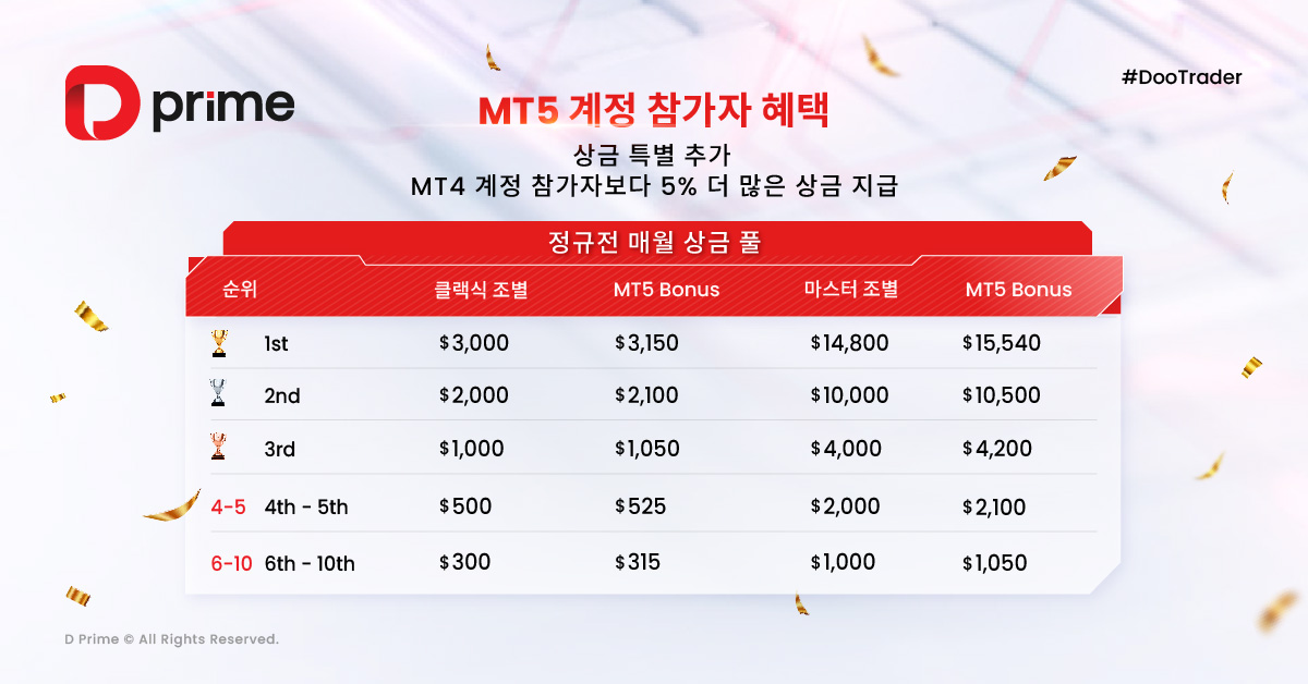 또한, MT5 계정으로 참가한 수상자에게는 기본 상금의 5%가 추가 보너스로 지급됩니다!