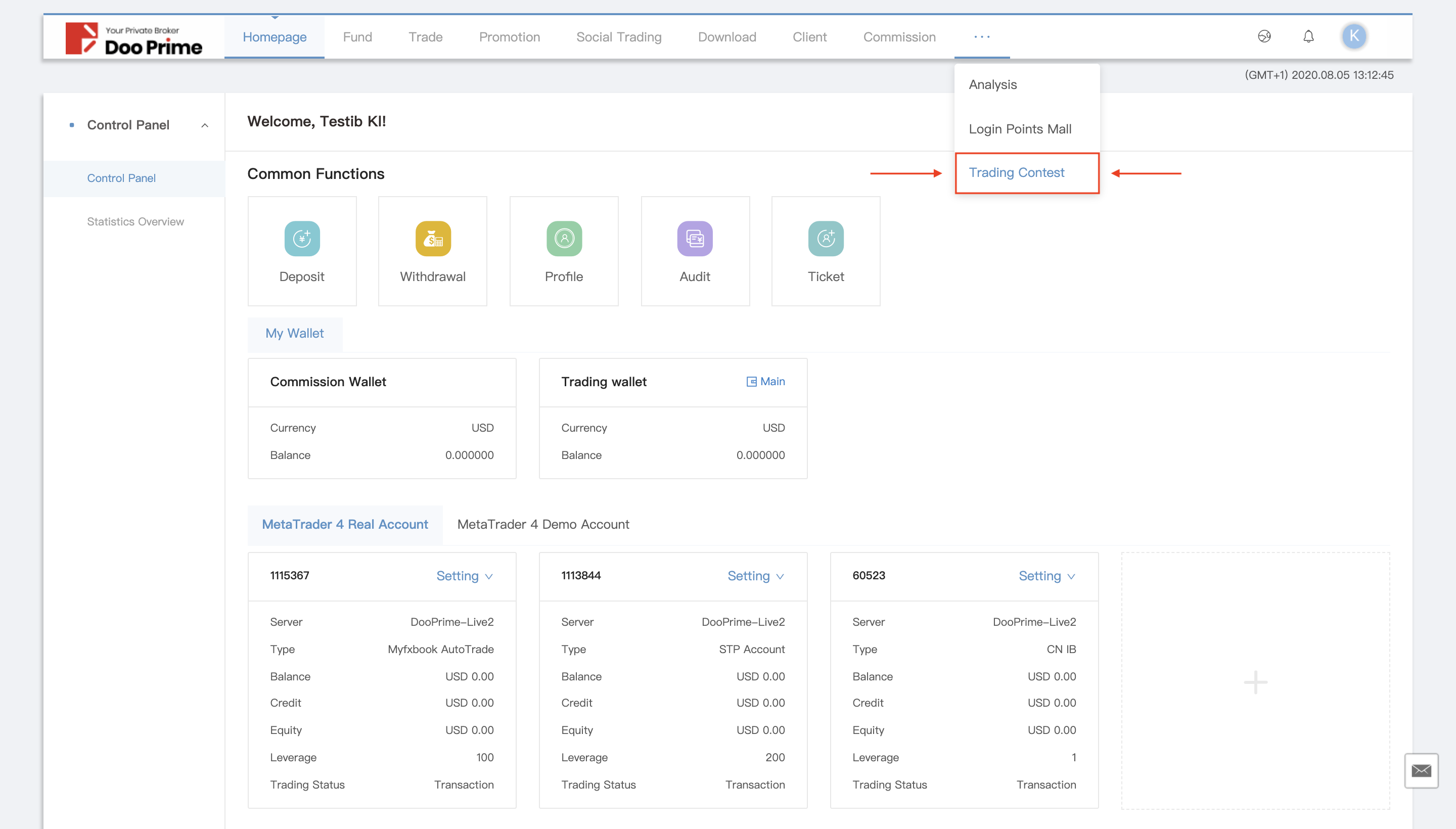③After registration, log in to Doo Prime’s CRM system, create a special MT4 account for the competition in the [Trading Contest] section, select the required account type, and enter after completing the initial deposit required.