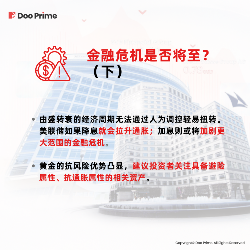 总之,对于美联储和欧洲央行而言,面对当前的危机如果选择继续加息,那么无疑是继续加大危机出现的可能性如果选择降息,那么无疑又是让之前为了压低通胀所做出的努力付之东流。在这种大环境下,黄金的抗风险优势凸显,因为如果加息,继而引爆危机,那么在恐慌情绪的刺激下黄金价格无疑将迎来上涨;而如果选择降息,那么通胀再度抬头,同样利好黄金这种大宗资产的价格。当前金融危机尚未全面爆发,但已然暗藏了潜在隐患。建议投资者关注具备避险属性、抗通胀属性的相关资产,这样无论危机是突然爆发,还是长期钝刀子割肉,投资者均能有备无患。