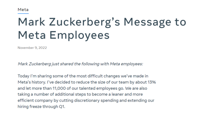 就在上周三 11 月 9 日,Meta 也经历了公司成立 18 年以来史上首次大规模裁员。首席执行官扎克伯格( Mark Zuckerberg )在公开信中确认了整体裁员涉及员工总数的 13%,人数达到 1.1 万人。Meta 人力资源主管 Lori Goler 称,54% 的被裁员工为业务岗,其余则为技术岗,Meta 招聘团队规模几乎被削减一半。公司还将把冻结招聘的期限延长到 2023 年第一季度。