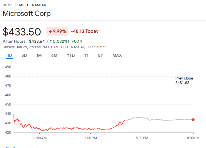受最新财报影响,微软公司股价周四下跌近 10%,为 2020 年 3 月以来最大单日跌幅,单日市值缩水 3,570 亿美元,创下美股有史以来第二大单日市值缩水纪录,仅次于英伟达去年创造的历史纪录。