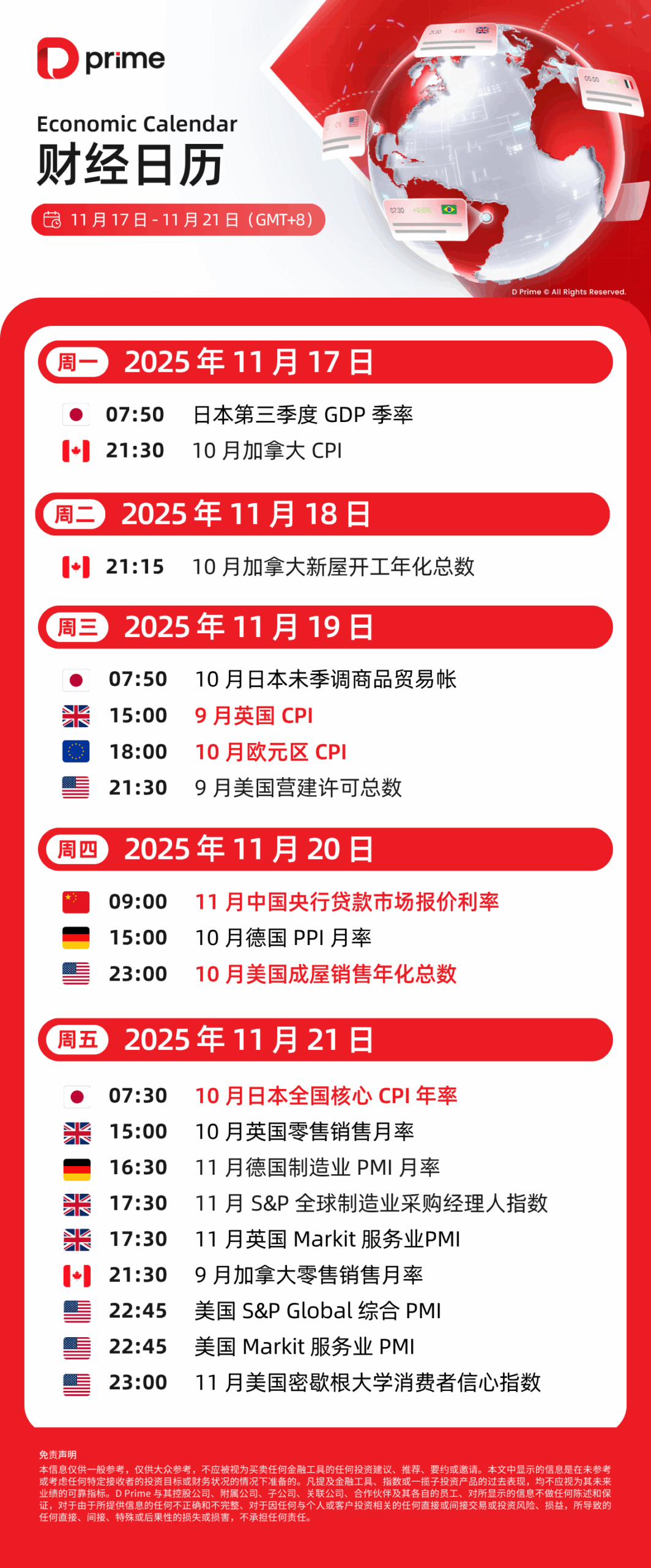 财经日历 | 以下为 2025 年 11 月 17 日至 2025 年 11 月 21 日(GMT+8 北京时间) 全球重大经济事件提醒。在重大行情期间,请确保您已审查您的保证金率,并有足够的保证金来支撑您的风险敞口。