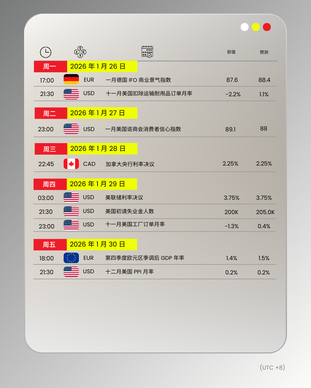 财经日历 | 以下为 2026 年 1 月 26 日至 2026 年 1 月 30 日(GMT+8 北京时间) 全球重大经济事件提醒。在重大行情期间,请确保您已审查您的保证金率,并有足够的保证金来支撑您的风险敞口。