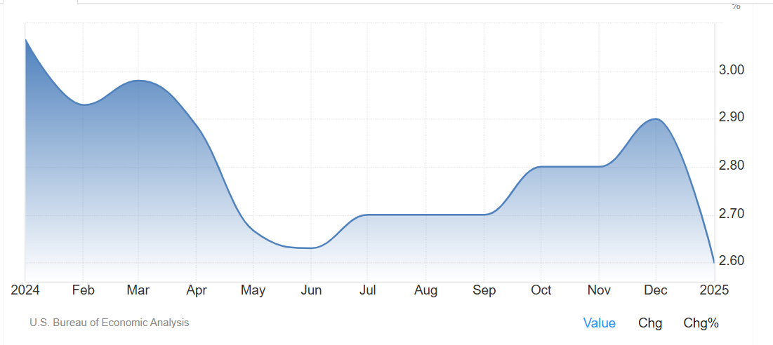 美国核心个人消费支出(PCE)价格指数在 1 月上升了 0.3%,年增率达到 2.6%,基本符合市场预期。这一增幅为 2021 年以来的最低之一。然而,市场依然受到贸易战的忧虑影响,特朗普计划对中国、加拿大和墨西哥加征关税,令全球股市承压。投资者关注特朗普是否会进一步扩大贸易战,这可能影响市场走势。
