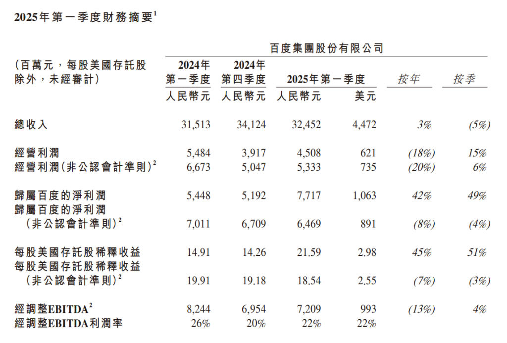 百度集团发布 2025 年第一季度财报:
