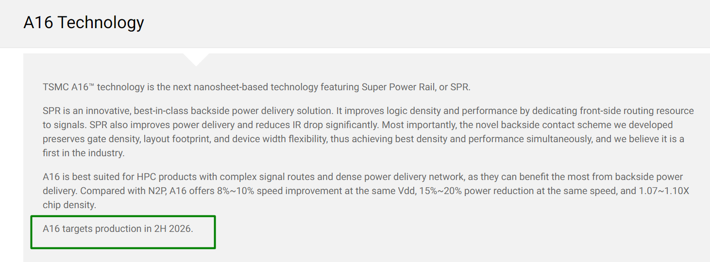 A16 是台积电目前已揭露最先进的制程节点,也是台积电迈入埃米制程的第一站,预定 2026 下半年量产。