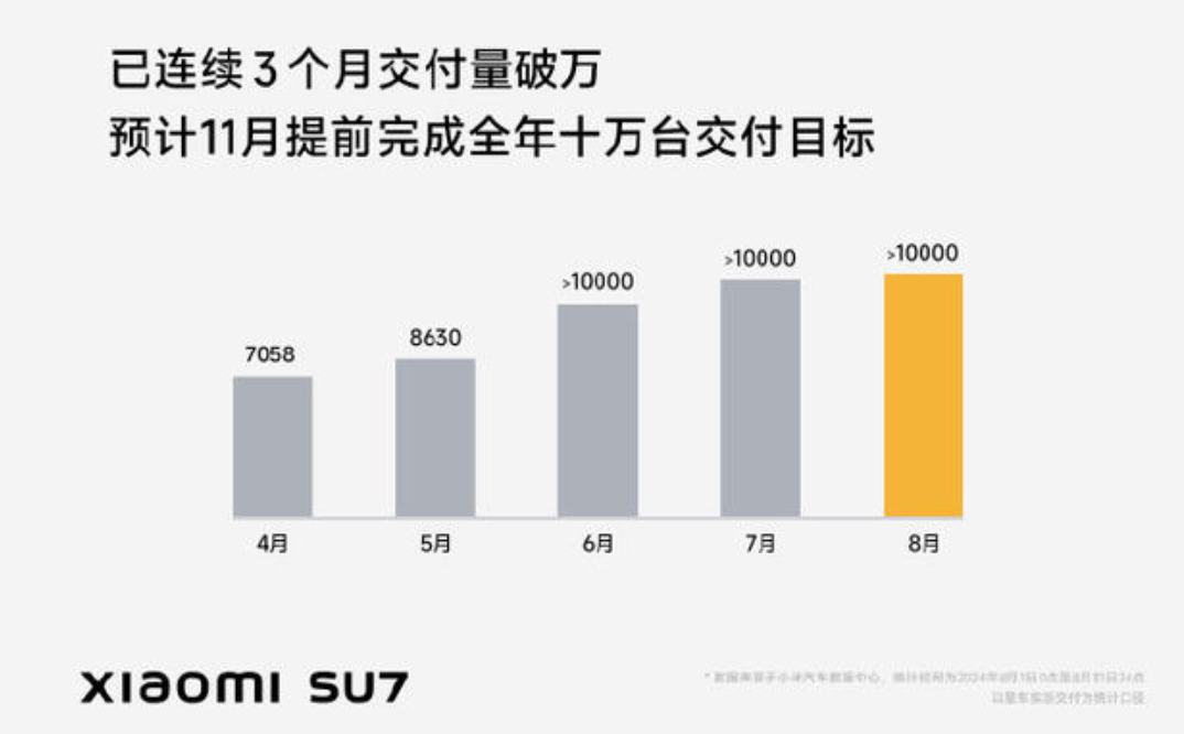 9 月 1 日,小米汽车、理想汽车等新能源车公布 8 月成绩单。据小米汽车消息,2024 年 8 月,小米 SU7 交付量超 10,000 台,目前已连续 3 个月达成破万交付目标,预计 11 月提前完成全年 10 万台交付目标。