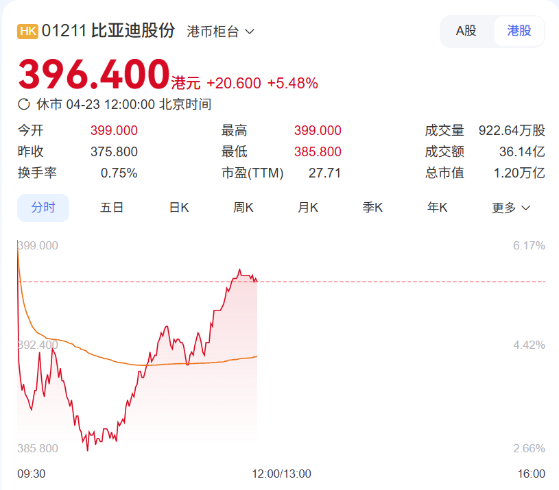 受此消息提振,比亚迪 23 日早盘高开逾 6%,截至发稿,涨 4.15%,报 391.4 港元,成交额 7.37 亿港元。
