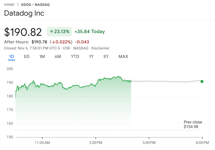 11 月 6 日至 7 日,云端监控龙头 Datadog(DODG)股价周四大涨 23.13%,收报 190.82 美元,创下自 2011 年 11 月 16 日以来的四年新高。该股单日上涨 35.84 美元,扭转前三个交易日累计下跌 4.8% 的颓势,同时成为标普 500 与纳斯达克 100 涨幅榜双冠王,今年以来累计上涨 33.54%。