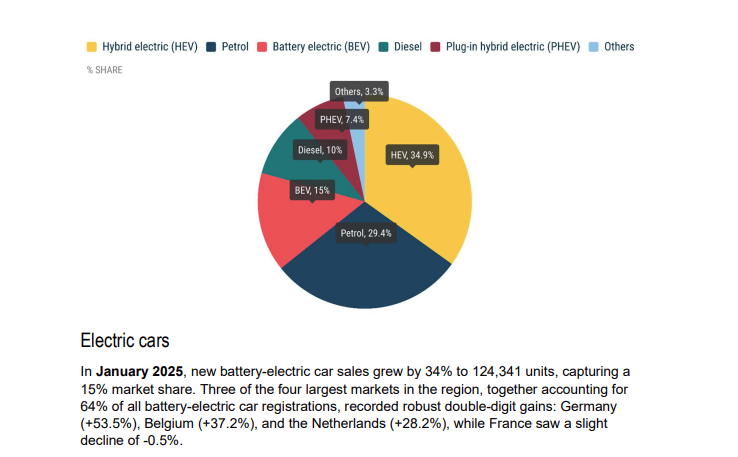 相比之下,今年 1 月欧洲电动汽车销量上涨了 34%,达到了 124,341 辆,电动汽车的市场份额从 10.9% 同比上升到了 15%,其中德国、比利时增长迅猛。