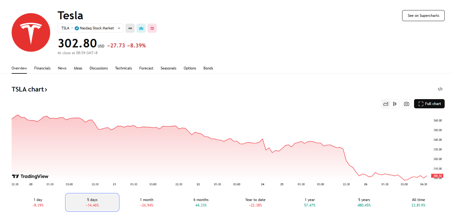 25 日美股收盘,特斯拉重挫 8.4%,报 302.80 美元,总市值骤降至 9,740 亿美元,为连续四个交易日断崖式下跌,市值随之跌破万亿美元大关,短短数日蒸发 1,860 亿美元。