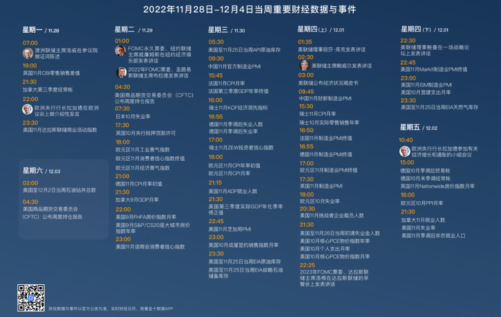 本周另一大焦点是美联储主席鲍威尔将于周四发表一场关于美国经济前景和就业市场的讲话,而在两天后,美联储将步入了 12 月中旬议息会议前的噤声期。鲍威尔周四的讲话非常关键,因为它将会巩固 12 月放缓加息步伐的预期,同时也可能影响市场对明年美联储利率峰值的预期判断。