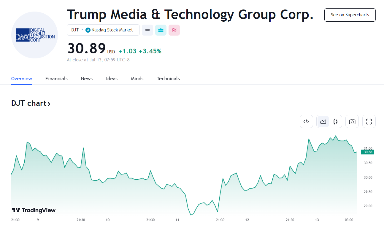 特朗普概念股夜盘交易集体暴涨,其中,特朗普媒体科技集团(DJT.US)夜盘大涨 21%,Phunware(PHUN.US)、Rumble(RUM.US)夜盘大涨近 20%。