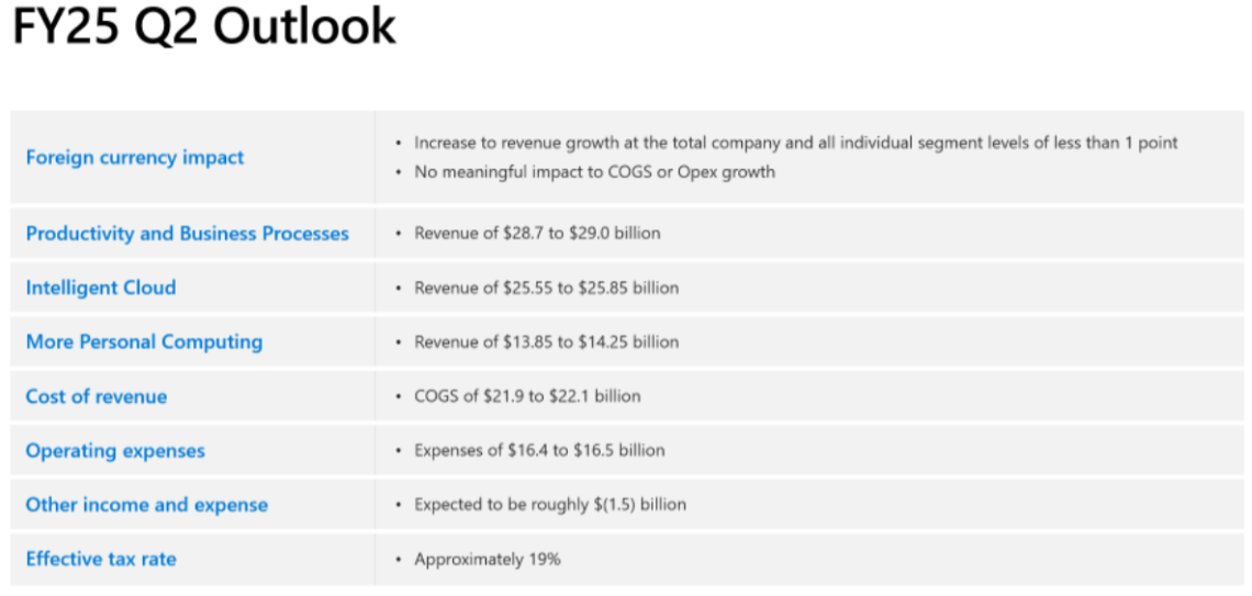 微软(MSFT)2025Q2 财报展望,第二季度预计营收为 681~691 亿美元,意味着年增长率为 10.6%,低于分析师预期的 698 亿,其中“生产力和商业流程”预计为 287~290 亿(年增 12%),“智慧云端业务”预计为 255.5~258.5 亿(年增 19%),而“个人运算”预计落在 138.5~142.5 亿(年减 4%)。