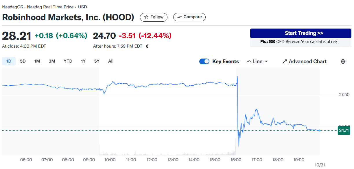 Robinhood Q3 财报未达预期,盘后时段下跌近 12.5%