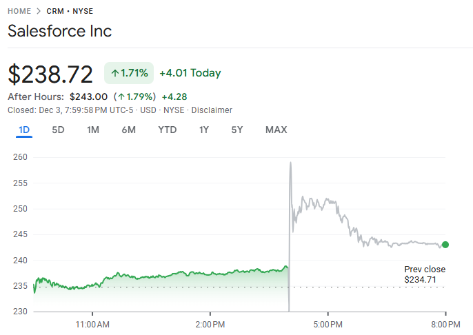 受此激励,Salesforce 盘后股价上涨约 2%,市场普遍认为公司在生成式 AI 与企业数据平台方面的布局将成为未来盈利的重要支撑。