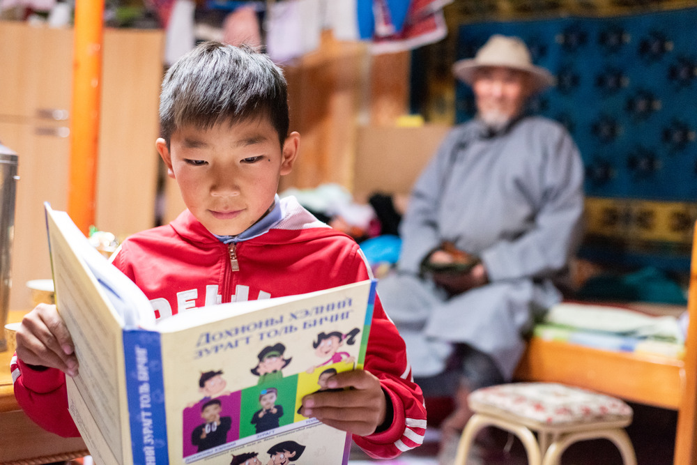 一位来自阿尔泰市第三普通教育学校的学生正在阅读联合国儿童基金会为失语儿童编写的手语书。