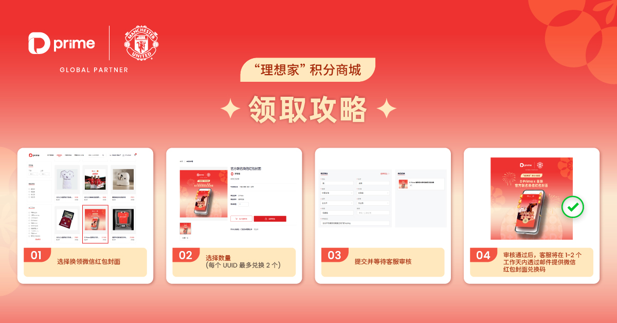 新春将至,好运开启!为感谢广大用户一直以来的陪伴和支持,D Prime “理想家” 积分商城重磅推出「 D Prime x 曼联 」新春限定联名微信红包封面,为你送上诚意满满的新年第一份礼!