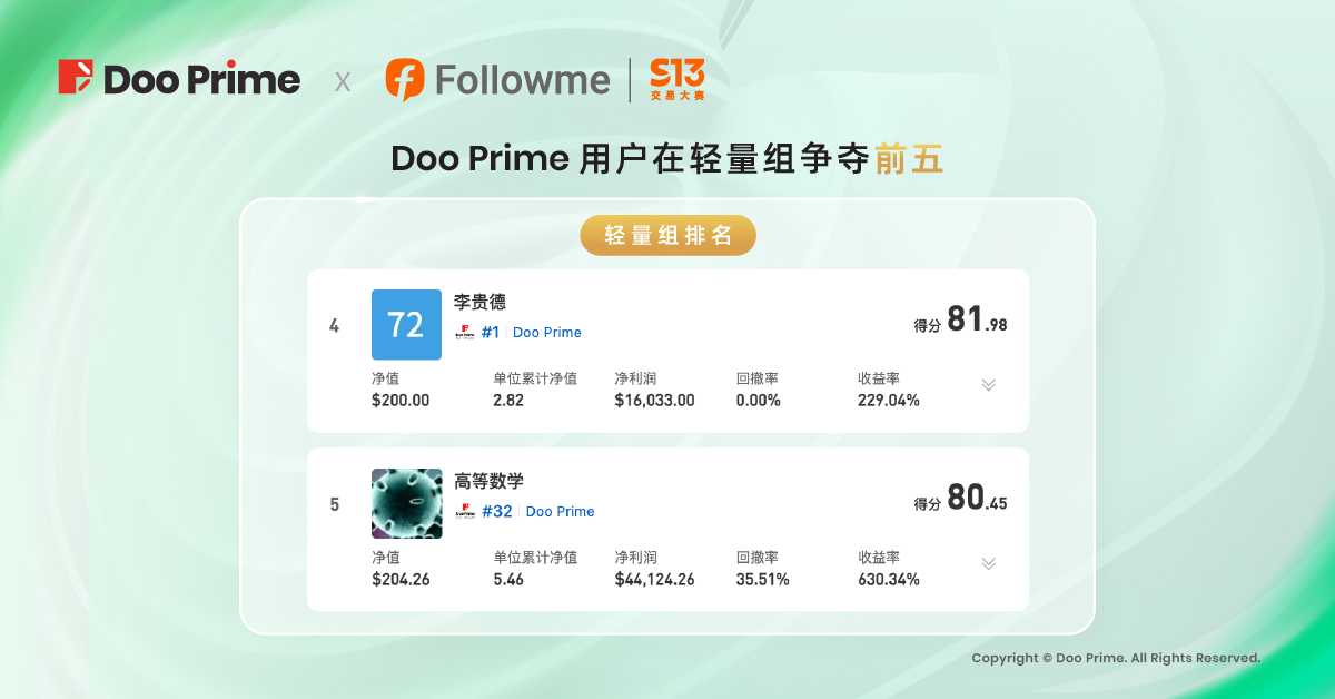 尽管 S13 交易大赛已正式落下帷幕,但投资者的交易新征程才正要启航。未来,Doo Prime 将一如既往,致力于为全球客户提供灵活高效的交易服务,助力投资者在交易大赛中再创巅峰!Doo Prime 还将携手 Followme 一同为广大交易员提供更多活动福利和奖励,敬请留守 Doo Prime 动态!