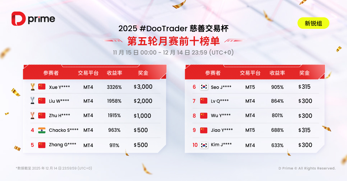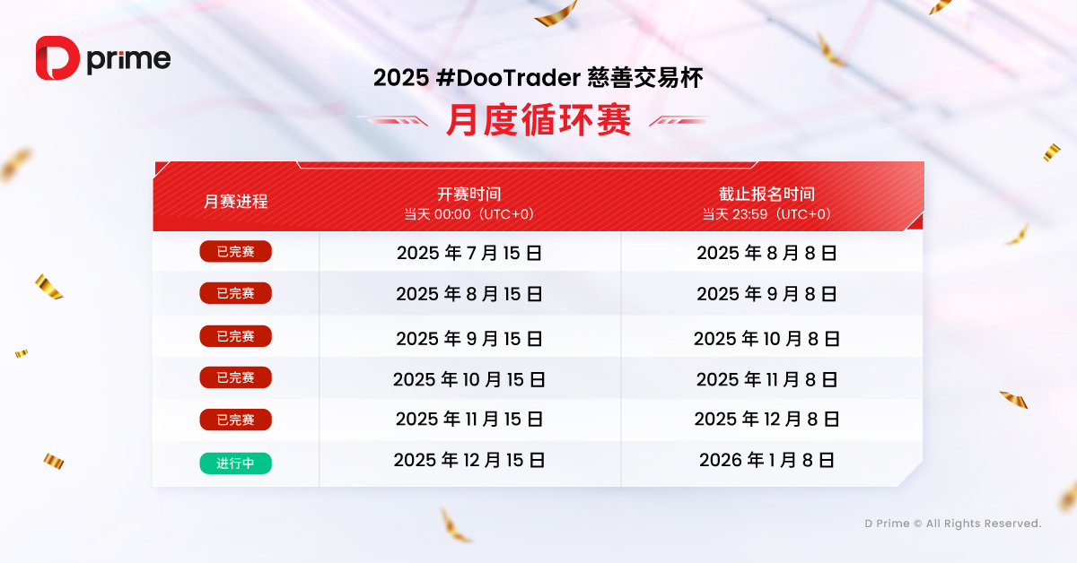 2025 年 D Prime #DooTrader 慈善交易杯第五轮月赛已于 12 月 14 日 23:59(UTC+0)顺利收官,赛果榜单火热揭晓!第六轮月赛紧随于 2025 年 12 月 15 日 00:00(UTC+0)开赛 —— 欢迎各路交易高手立刻报名,争夺最后轮月赛破浪组 TOP5 晋级线下岛屿争霸赛名额!