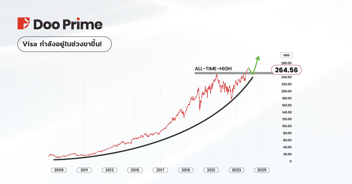 จากมุมมองทางเทคนิค ปัจจุบันหุ้นของ Visa มีการซื้อขายที่ระดับสูงสุดใหม่ตลอดเวลา ตามหลักการแล้ว การกลับตัวลงมาที่ 250–240 อาจเป็นโอกาสซื้อที่ดีสำหรับการถือครองระยะยาว