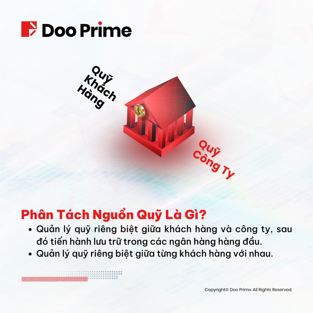 Nhằm đảm bảo nguồn quỹ của khách hàng được tách biệt và bảo mật tuyệt đối, Doo Prime đã thiết lập mối quan hệ đối tác với các ngân hàng hàng đầu thế giới. Ngân hàng cấp đầu tư như Barclays Bank, từ lâu đã được được biết đến với sức mạnh và sự ổn định trong xuyên suốt quá trình hoạt động. Đây cũng là lý do khiến Doo Prime quyết định chọn làm nơi giữ gìn và phân tách các nguồn quỹ của khách hàng khỏi quỹ hoạt động của công ty.