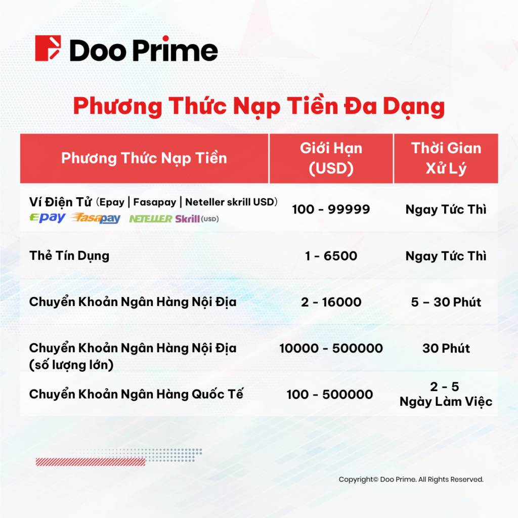 Ngoài ra, để nâng cao trải nghiệm giao dịch của bạn, chúng tôi cung cấp một loạt các tùy chọn nạp và rút tiền an toàn, mang đến cho bạn sự linh hoạt và đảm bảo. Như vậy, các nhà đầu tư có thể hoàn toàn tập trung vào chiến lược giao dịch hiện tại. Thông qua đó, Doo Prime cam kết luôn đặt sự hài lòng và an toàn của quý khách hàng lên trên hết.