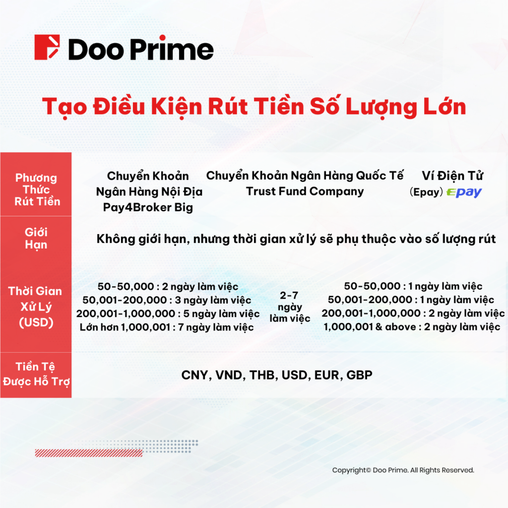 Chính vì thế, tại Doo Prime, chúng tôi cung cấp một loạt các tùy chọn, trong đó bao gồm chuyển khoản ngân hàng nội địa và chuyển khoản ngân hàng quốc tế, với khả năng rút tới 159,000 USD trong một giao dịch bất kỳ từ ngân hàng nội địa và 228,682.42 USD từ ngân hàng quốc tế. Riêng về phía Doo Prime, đội ngũ chuyên gia của chúng tôi cam kết làm việc hết mình nhằm xử lý các yêu cầu rút tiền từ khách hàng một cách nhanh chóng và an toàn, từ đó đảm bảo rằng quỹ của khách hàng luôn có thể truy cập được khi cần.