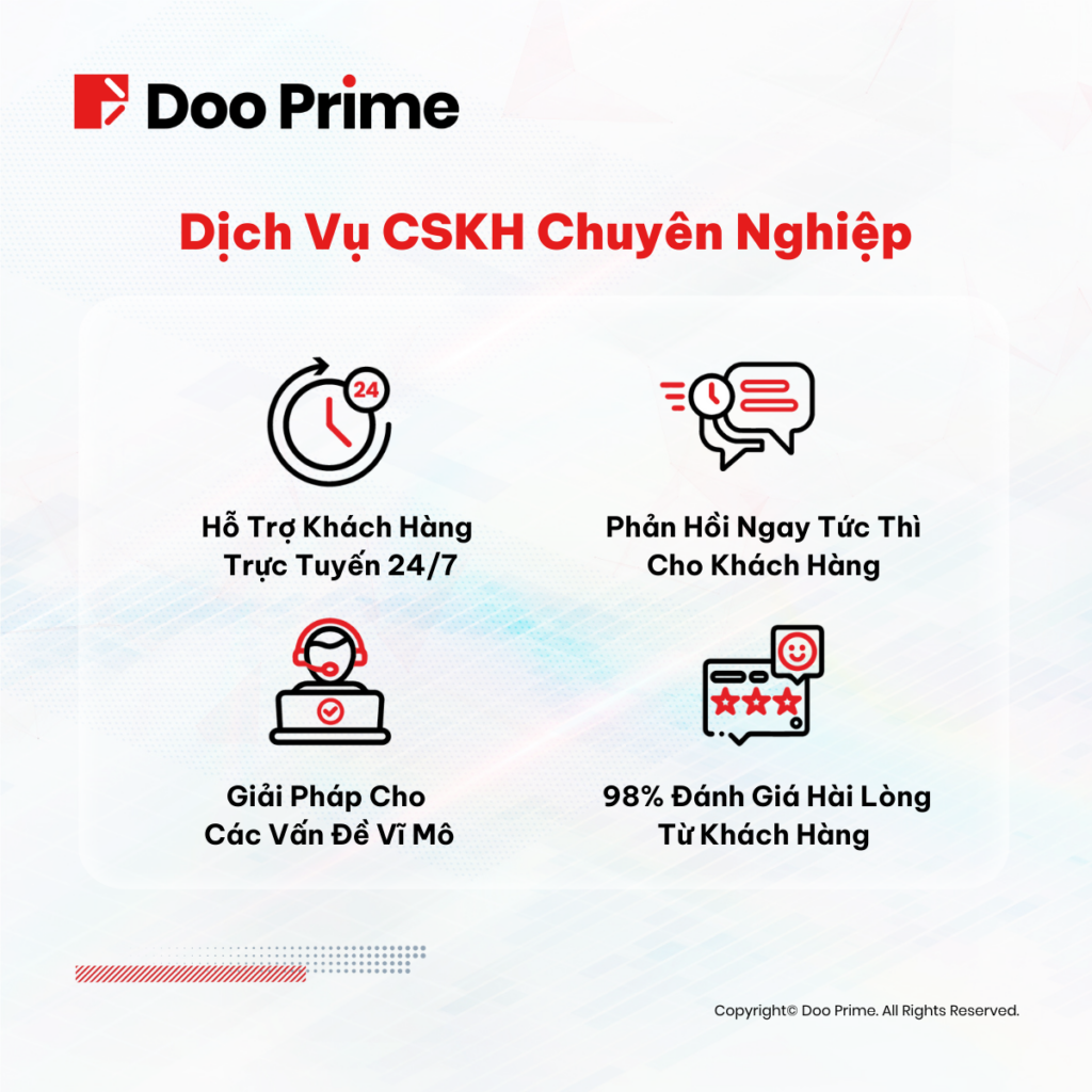 Bộ phận CSKH của Doo Prime luôn trực sẵn 24/7 nhằm cung cấp các giải đáp chuyên sâu về sản phẩm, dịch vụ bằng nhiều thứ tiếng khác nhau, trong đó có tiếng Anh, tiếng Trung, tiếng Hàn, tiếng Thái và tiếng Việt. Với nhiều kênh dịch vụ khách hàng như trò chuyện trực tuyến (live chat), điện thoại, email cùng người quản lý tài khoản cá nhân, chúng tôi cam kết cung cấp trải nghiệm liền mạch cho quý khách hàng. Điều này được thể hiện qua tỷ lệ hài lòng của khách hàng đối với chúng tôi (98%) vào cuối năm 2022. Đây rõ ràng là một minh chứng “sống” cho chất lượng của dịch vụ chăm sóc khách hàng của chúng tôi.