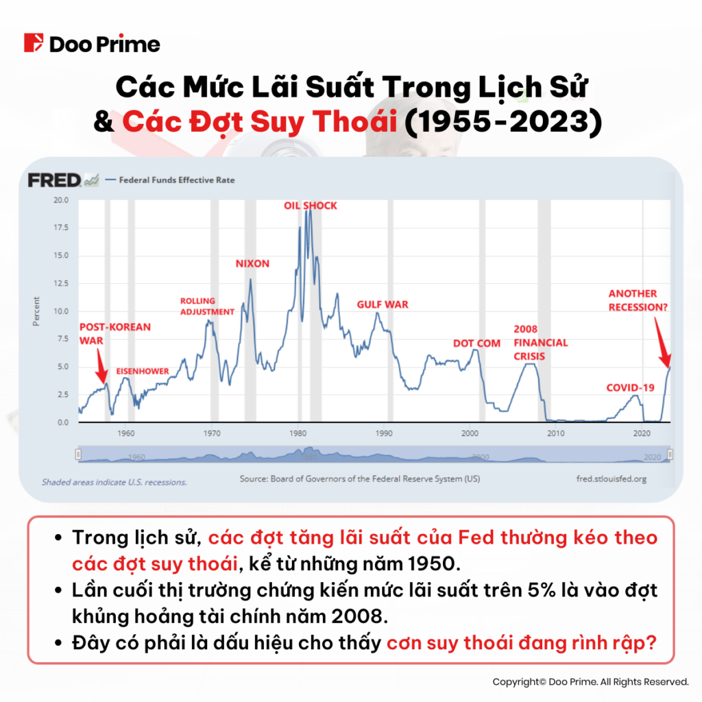Biểu đồ trên cho thấy rằng chúng ta có thể đang trong thời kỳ muộn của chu trình kinh tế, với mức lãi suất tiếp tục tăng cao. Bên cạnh đó, lịch sử cho thấy rằng, chúng ta hoàn toàn không nên xem nhẹ những hậu quả tiềm tàng đến từ chính sách thắt chặt tiền tệ của Fed. Nếu đây chính là những gì chúng ta phải đối mặt trong thời điểm hiện tại, thì việc “đứt gãy” trong nền kinh tế, khiến tình trạng suy thoái xảy ra chỉ là vấn đề thời gian.
