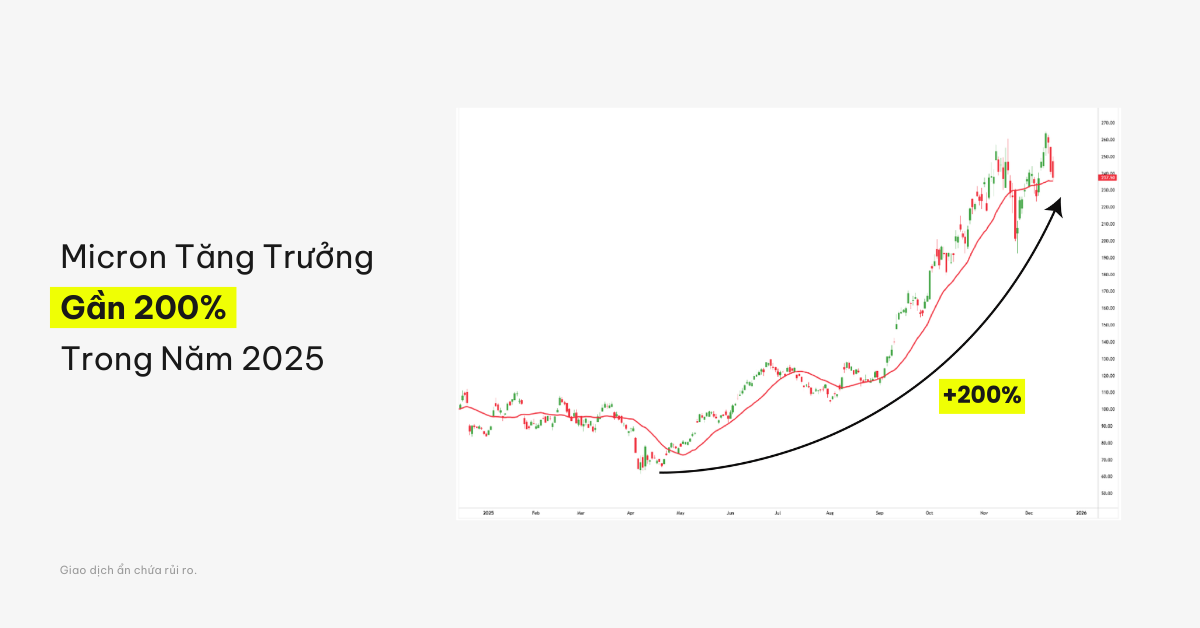 Cổ phiếu Micron (MU) tăng khoảng 200% so với vùng đáy của năm 2025. Thành tích này khiến MU trở thành một trong những mã có mức tăng mạnh nhất năm.