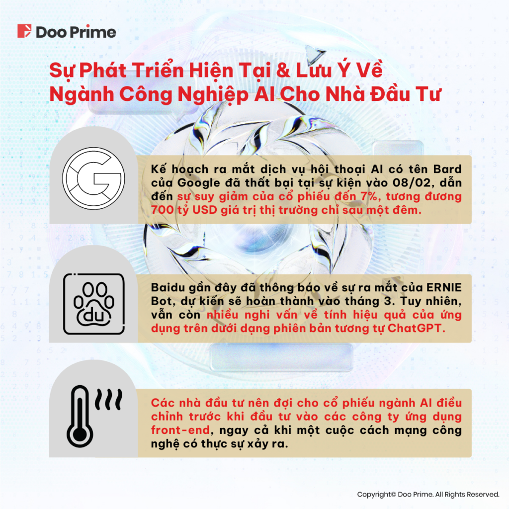 Điều này cho thấy rằng, các nhà đầu tư đã giao dịch với kỳ vọng rằng công nghệ AI sẽ thúc đẩy sự phát triển vượt trội của các công ty ứng dụng AI mảng front-end trong tương lai. Kết quả là giá cổ phiếu của Baidu và Microsoft đã tăng. Tuy công nghệ AI có thể dẫn đến một cuộc cách mạng mới, nhưng các nhà đầu tư cũng nên cân nhắc về tính thời điểm của xu thế trên. Cụ thể, trước khi trực tiếp đầu tư vào các công ty ứng dụng mảng front-end, các nhà giao dịch nên xem xét việc chờ đợi đợt bùng nổ hiện tại qua đi, đi kèm sau đó là một đợt điều chỉnh trên diện rộng của cổ phiếu.